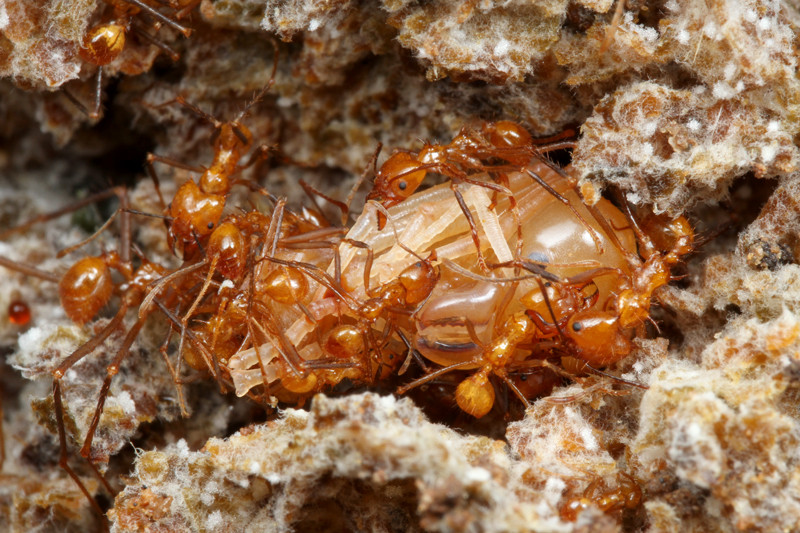 同じく菌を育てるキノコシロアリなどは、糞を培地として使うため、ある程度硬い菌園ができますが、細かく刻んだ植物の葉を培地として使うハキリアリの菌園は驚くほどフワフワで、気を付けて持ち上げないと崩れてしまいそうなほど柔らかいのです。
