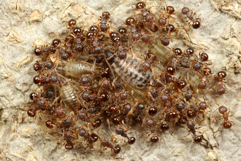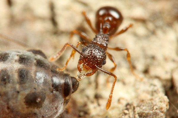 ヤノクチナガオオアブラムシStomaphis yanonis に集まるアミメアリPristomyrmex punctatus 。