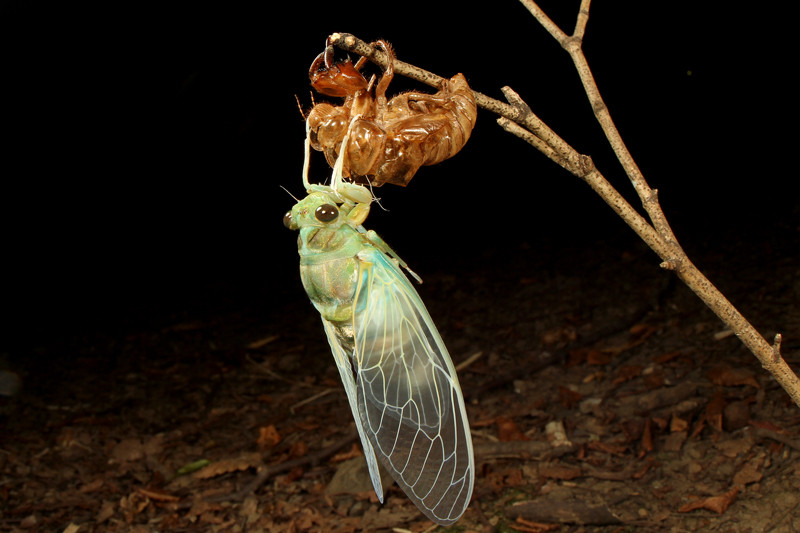 高さ数メートルもの高い場所で羽化する個体もいれば、足元に落ちた枯れ枝で羽化するものもいます。