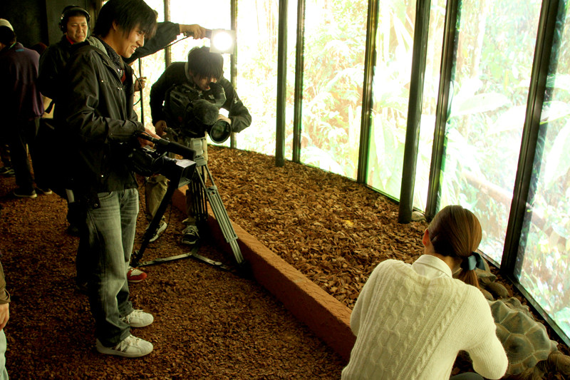 ゾウガメふれあいコーナーを撮影するテレビ局の方々。