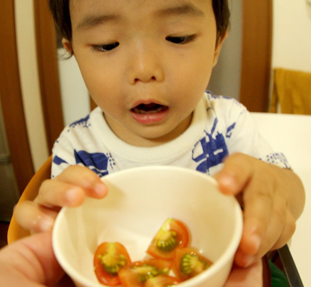 小さな子供は、ミニトマトを喉に詰まらせる事があるため小さく切ってあげます。