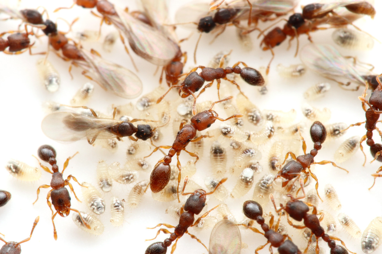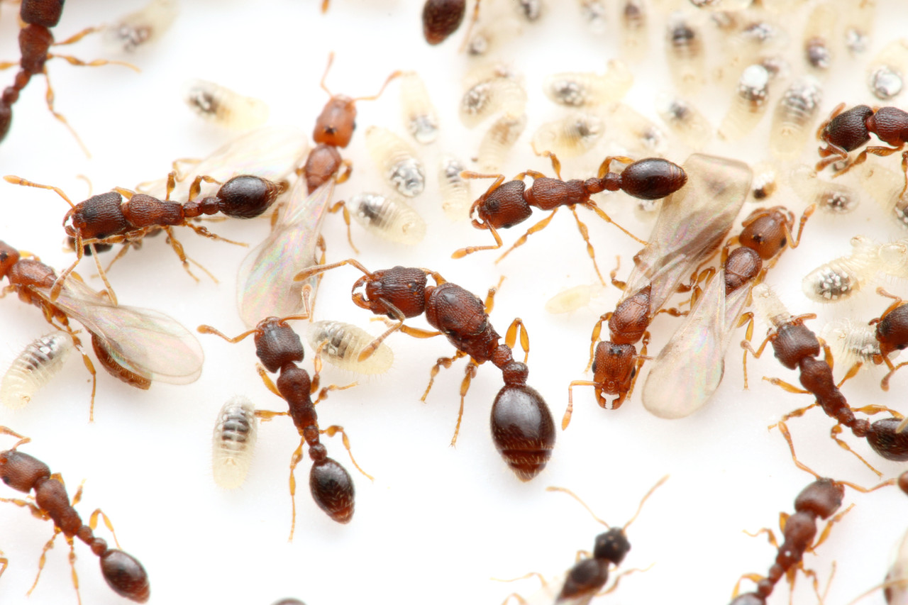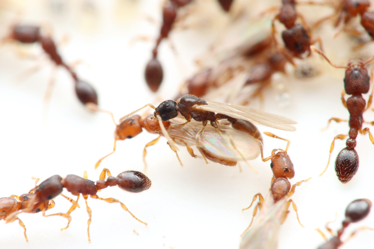 中心にいる大きな個体はウメマツアリの女王アリですが、その周りにいる翅の生えた新女王アリはウメマツアリではなく、ウメマツアリに社会寄生をするヤドリウメマツアリVollenhovia nipponicaの新女王アリたちです。