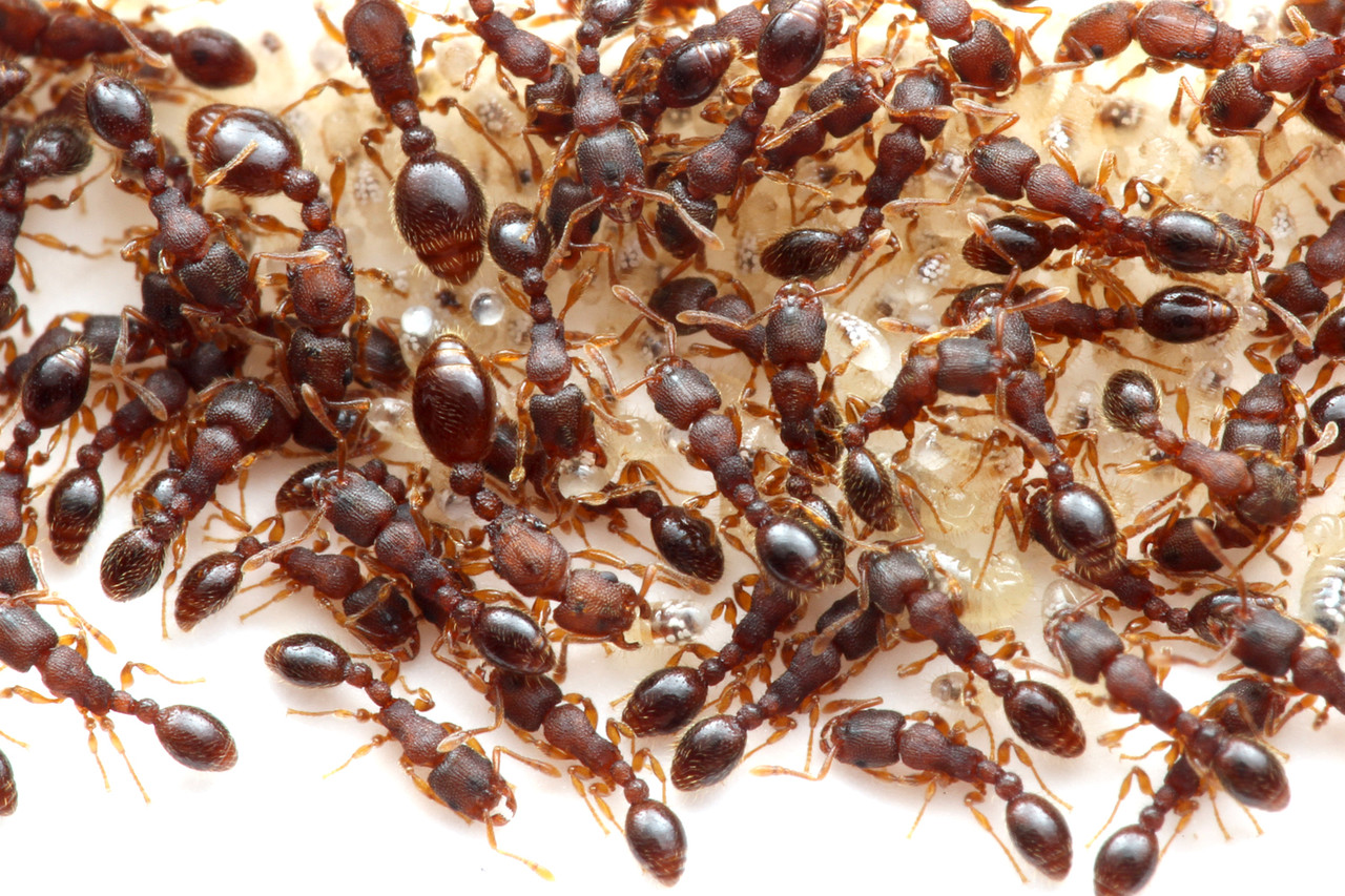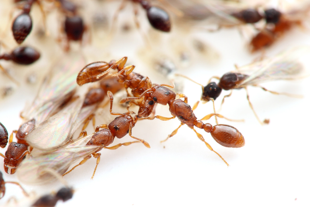 巣の中で交尾をするヤドリウメマツアリの新女王とオス。
