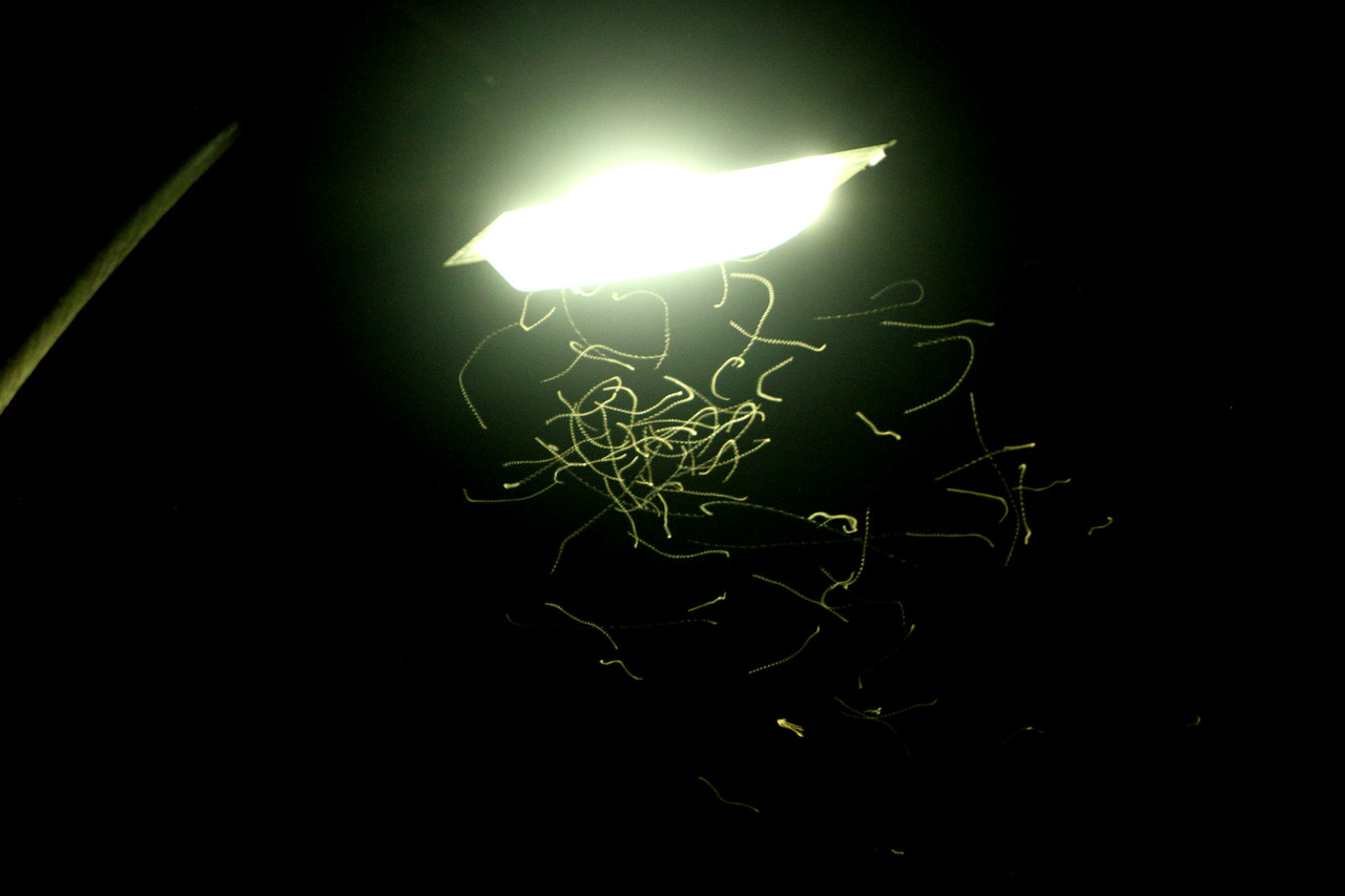 街灯の周りを飛ぶキイロシリアゲアリの羽アリ。