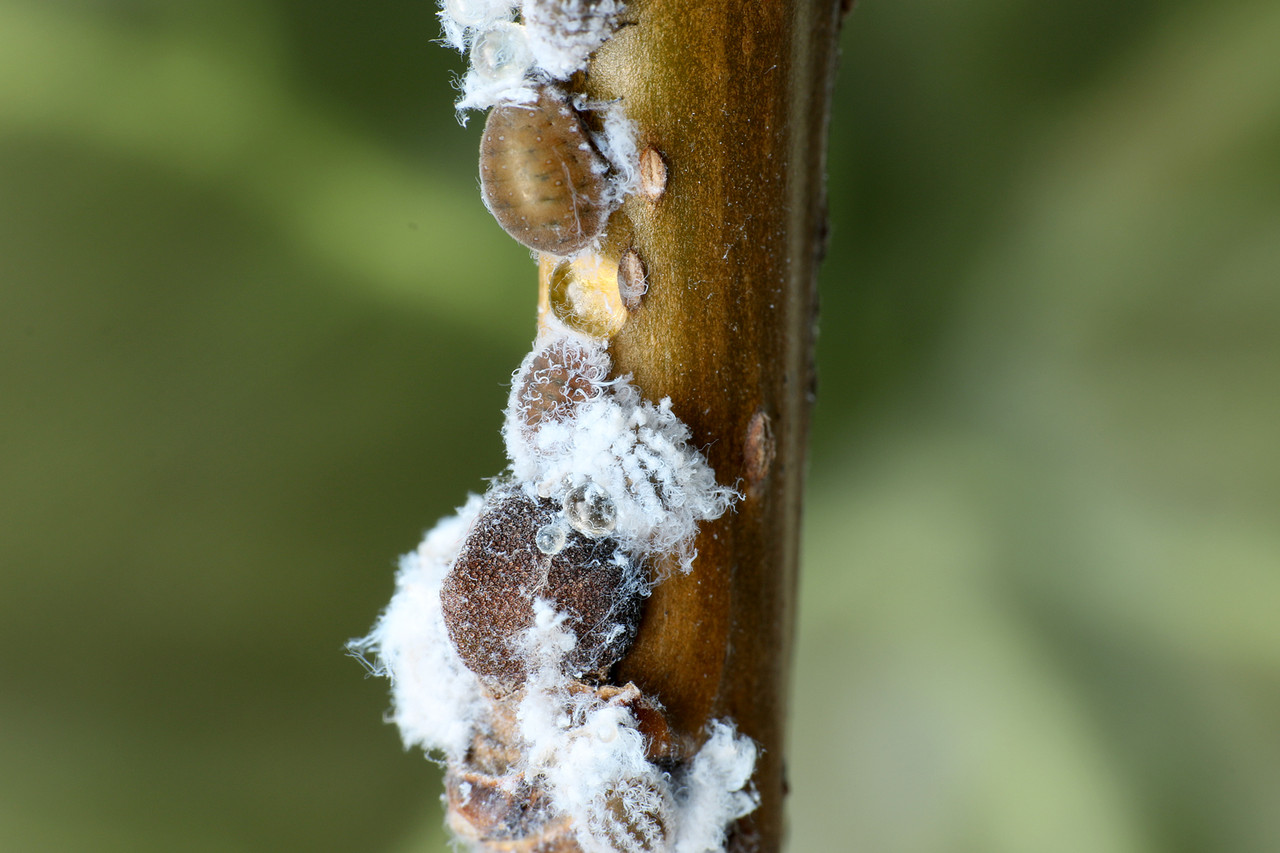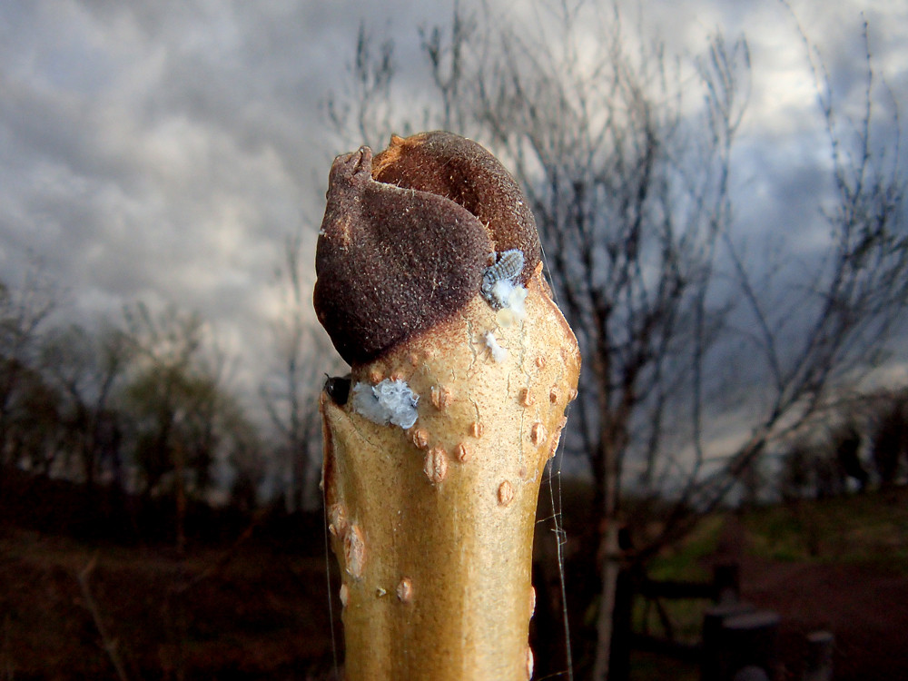 ヤチダモの新芽を見ると、白い綿のようなものが付いていますが、これが卵から孵化した雪虫の幼虫です。