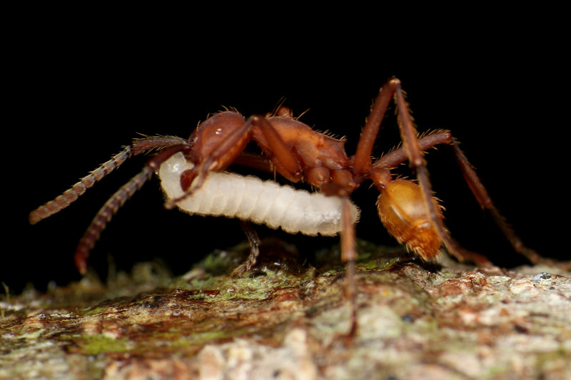 この写真の働きアリが運ぶ幼虫は、狩りで捕えた獲物のアリの幼虫ではなく、このグンタイアリの幼虫です。