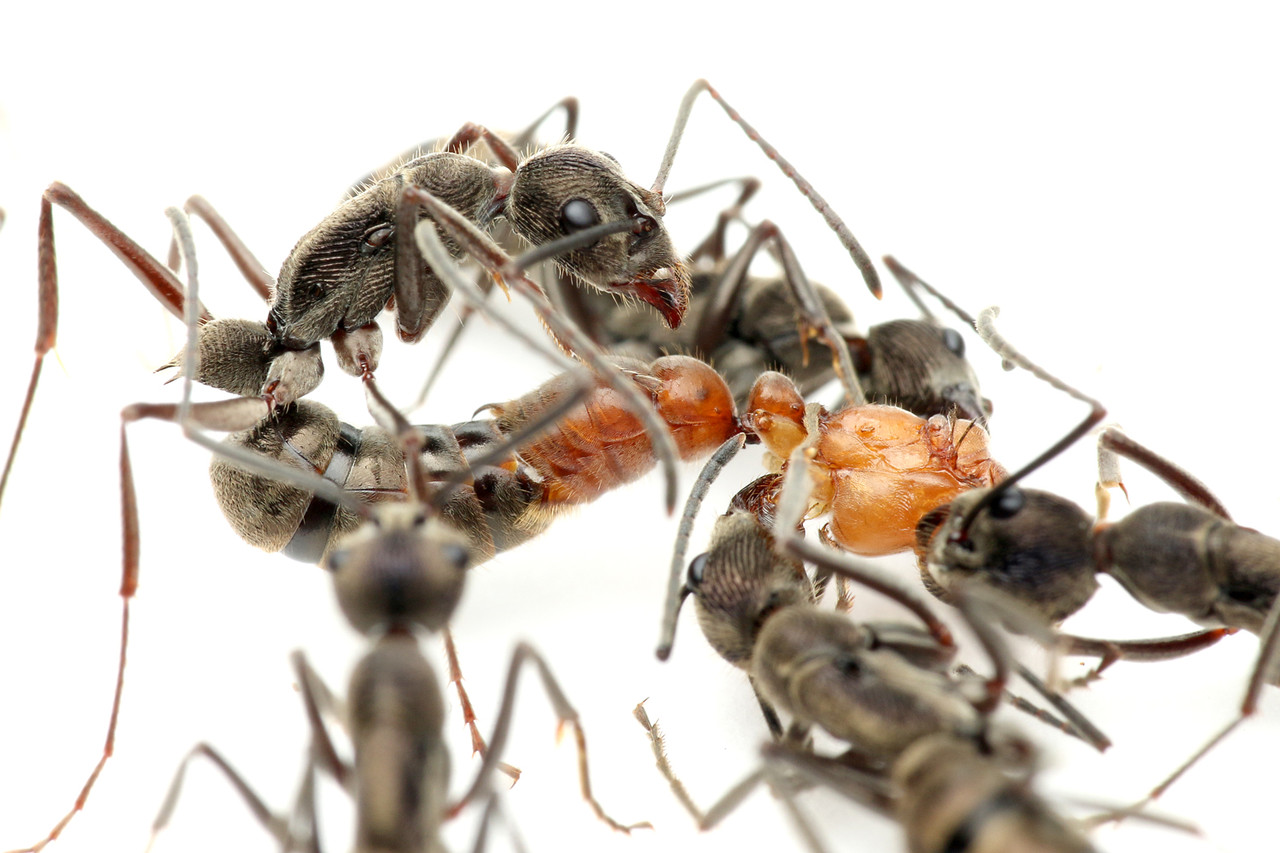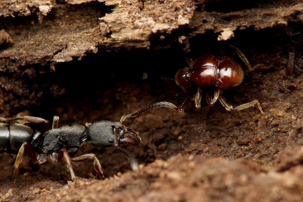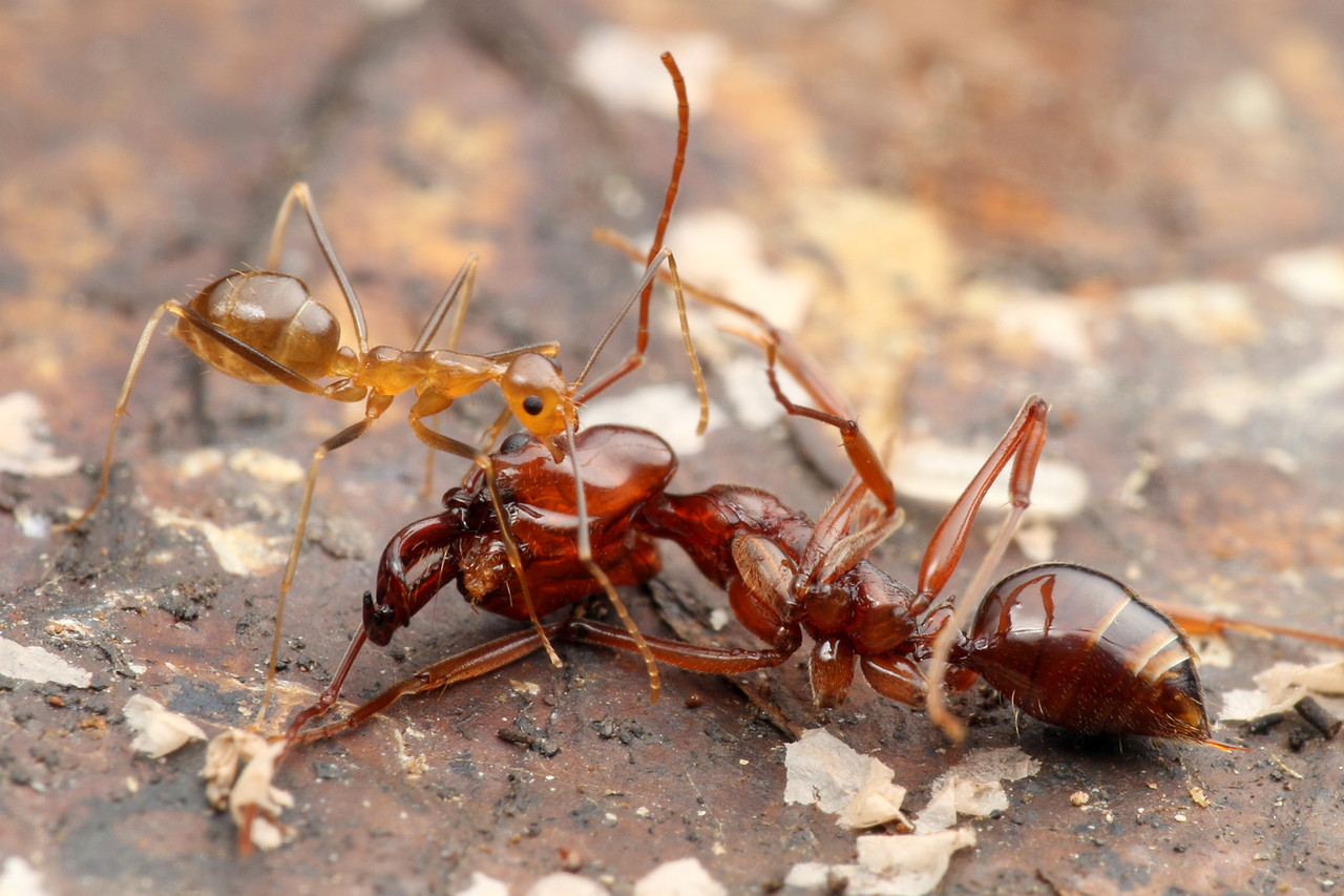 マレーシアの森で、サスライアリ(右)と戦っていたアギトアリ(左)。