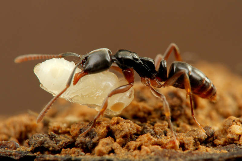 幼虫の世話をするインドクワガタアリ。