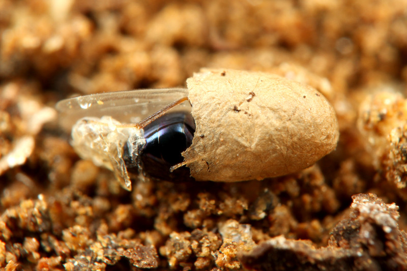 アリの幼虫が作った繭の中にいることから、アリの幼虫が繭を作りサナギになる頃までは、体内でおとなしくしていて、その後、アリの幼虫を食べ尽くしてサナギになるものと思われます。