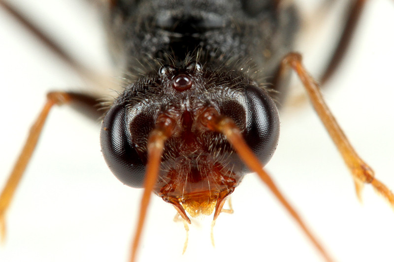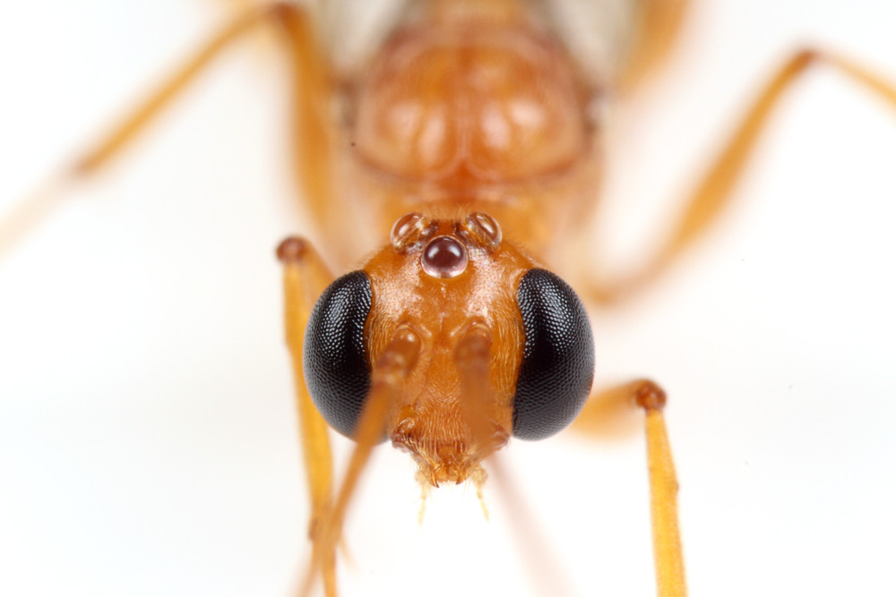 大きな複眼と単眼で、アゴは短く、オス同士はとてもよく似た特徴です。