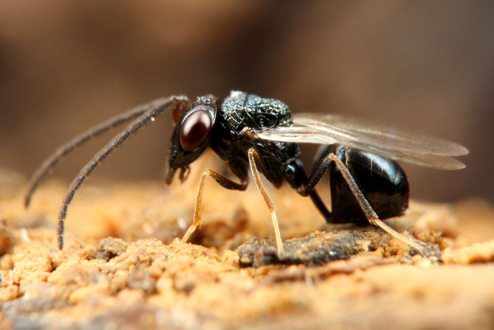 今から10年近く前の話ですが、石垣島でツヤオオハリアリのコロニーを採集して飼育をしたいたところ、繭から羽化してきたのはアリではなく小さなハチでした。