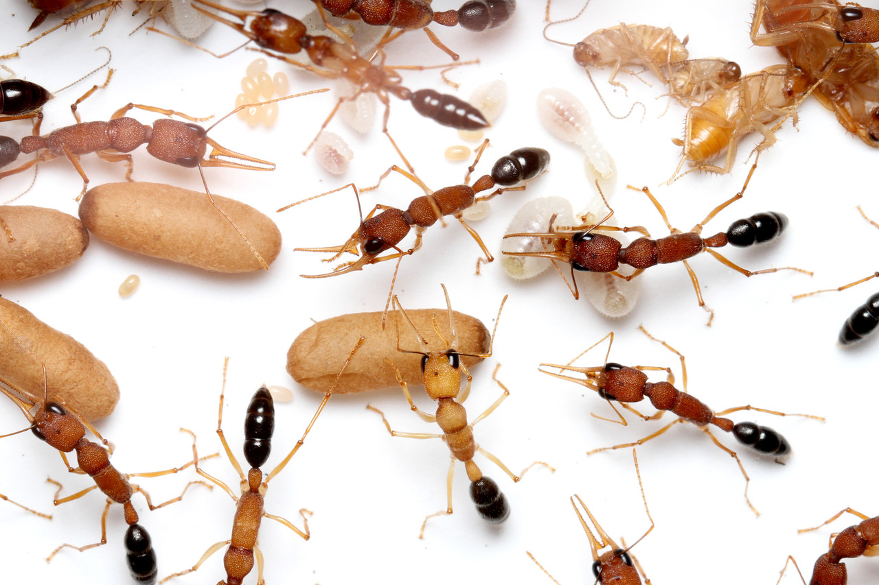 タイワンシロアリの成虫と孵化したばかりの幼虫。