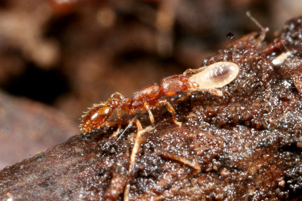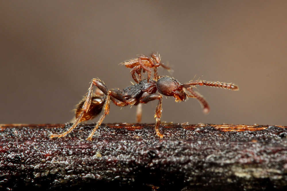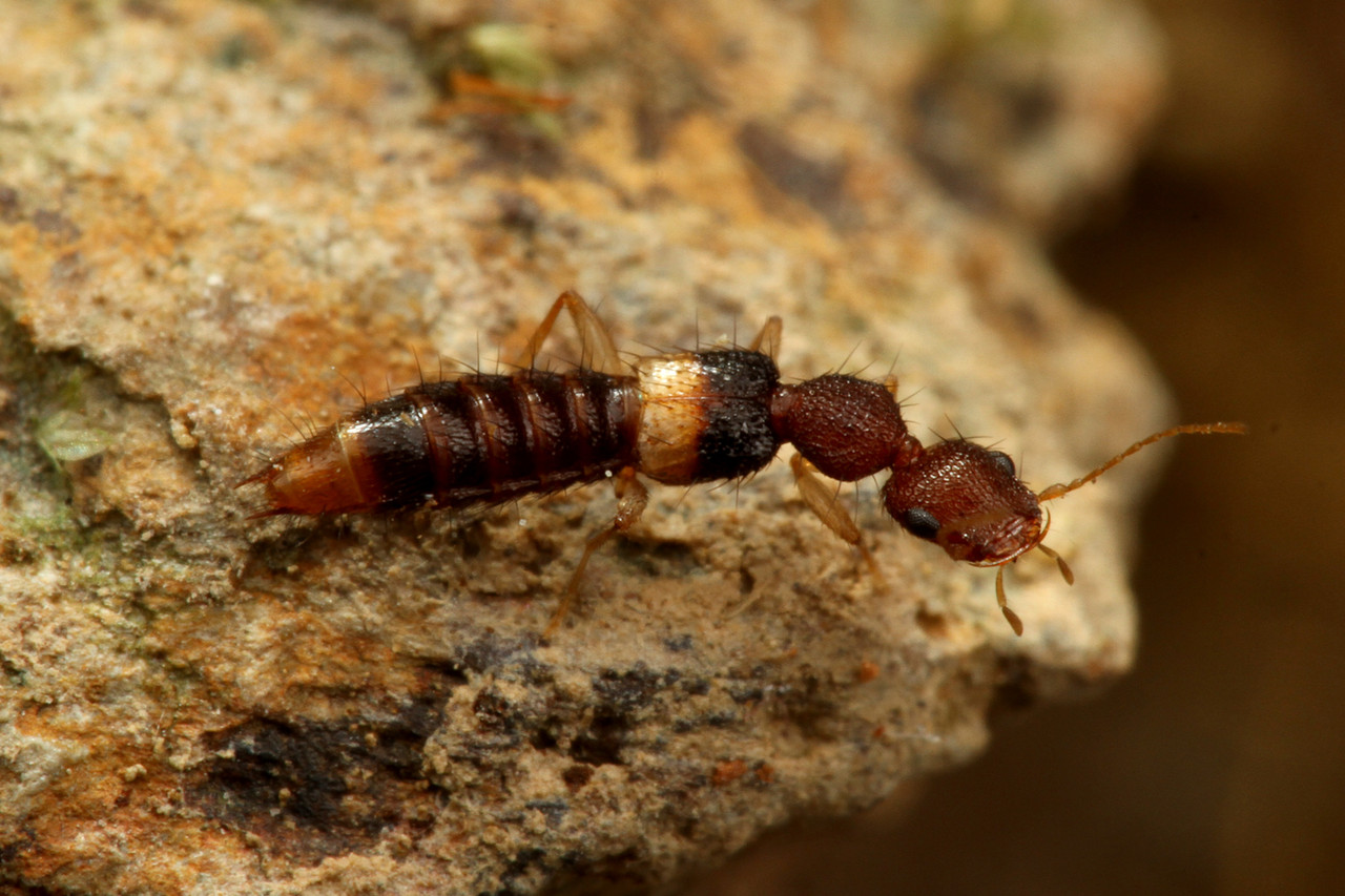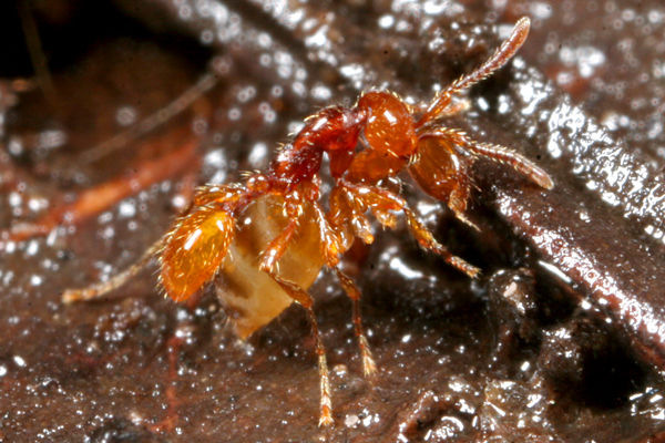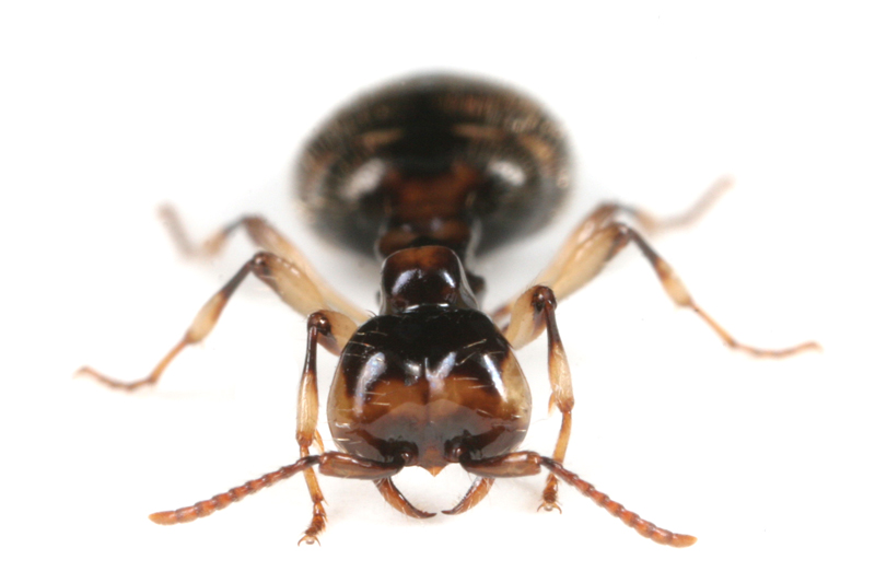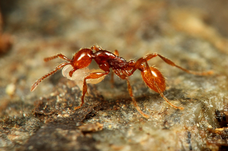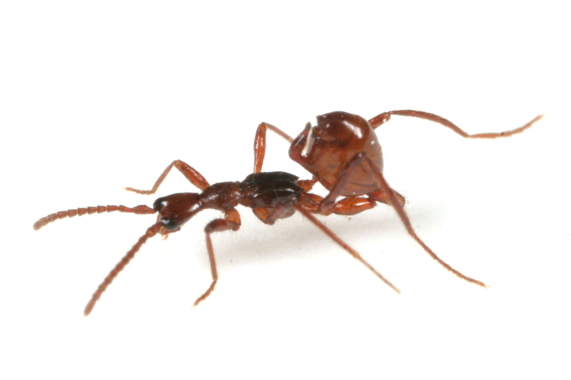 アリによく似たハネカクシで、多くの個体は、アリに運ばれていました。