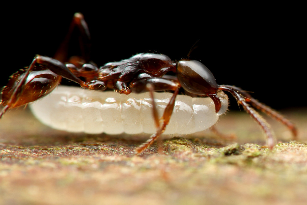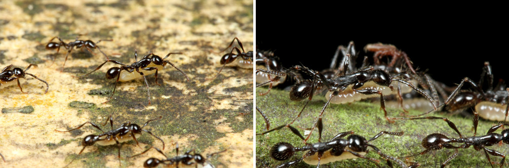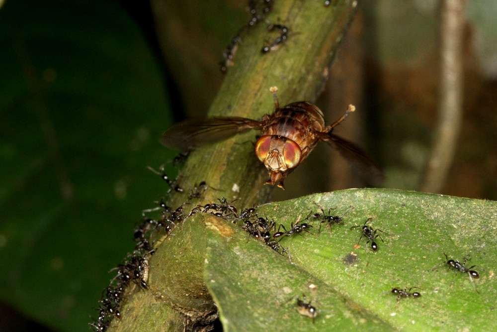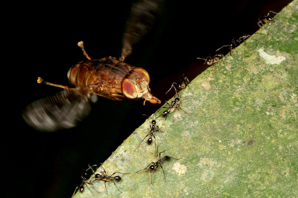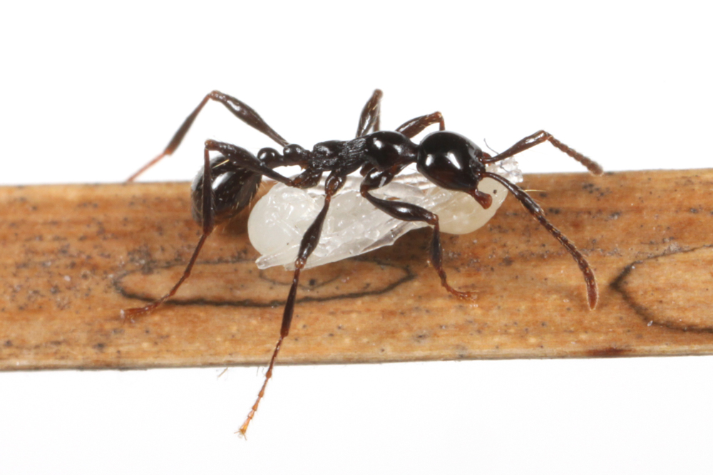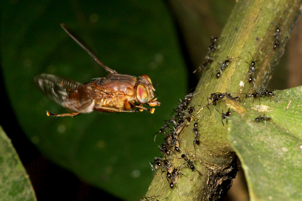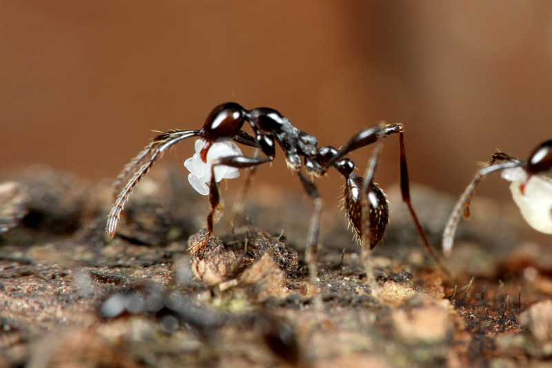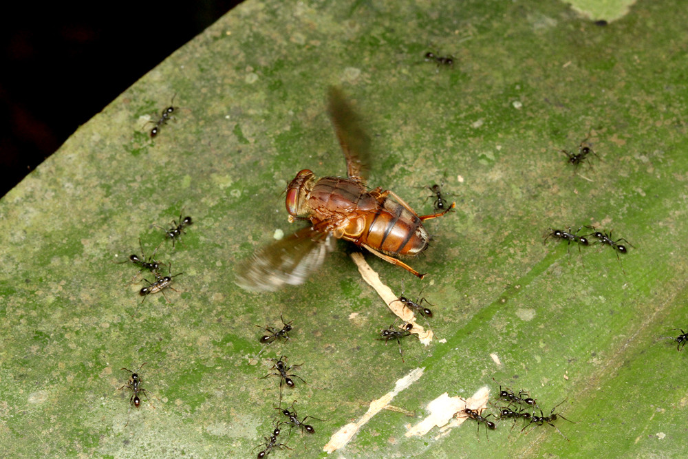 ベンガルバエが狙うのはアリが運ぶ幼虫です。