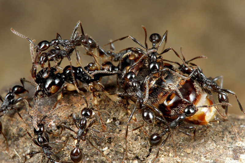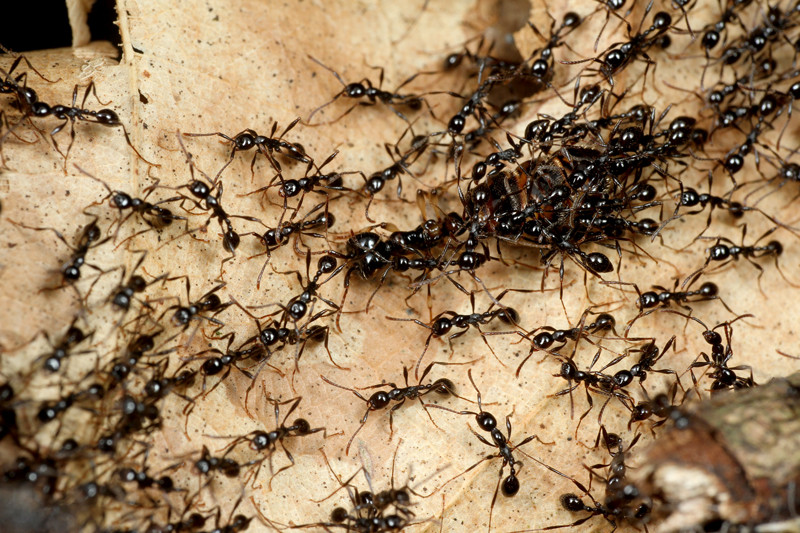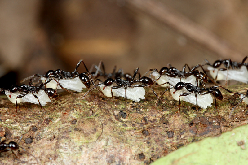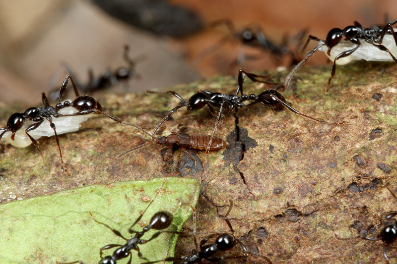 アリの幼虫を見つけると、始めは数匹の働きアリしかいませんが、数分後には数十匹ものグンタイアリが集まってきて、あっという間に幼虫を奪っていってしまうのです。