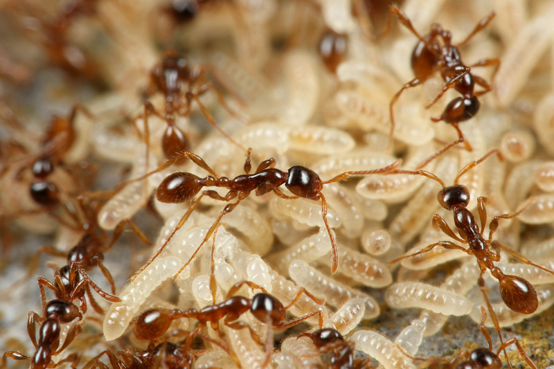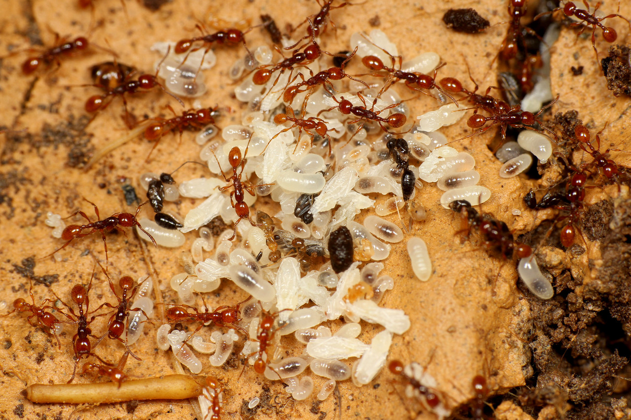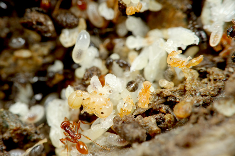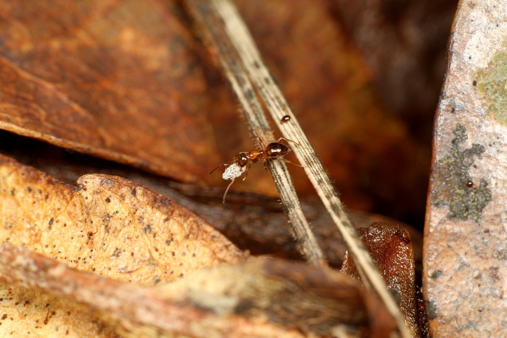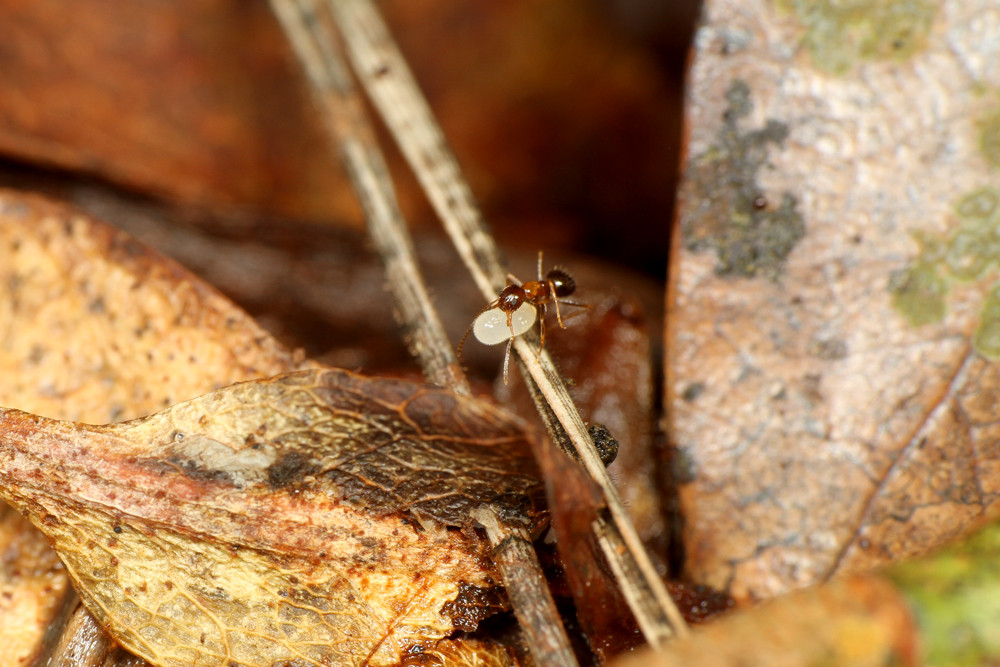 すると、枯れ葉が積もった場所に、ものすごい数の働きアリが群れていて、よく見ると幼虫もいたのです!