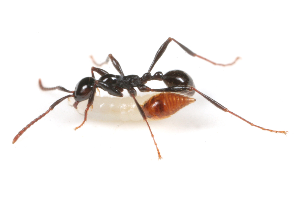 アリは幼虫をアゴで咥えているので、普通に考えればアリも一緒に付いてくるはずなのです。