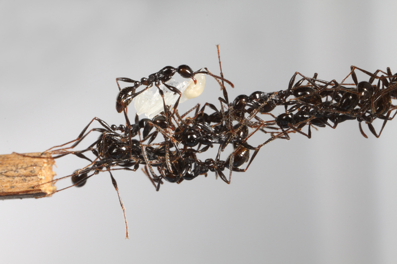 引っ越しの最中に、足場がない時は、働きアリ同士で脚を繋ぎ合わせて『働きアリの橋』を作って仲間たちを助けます。