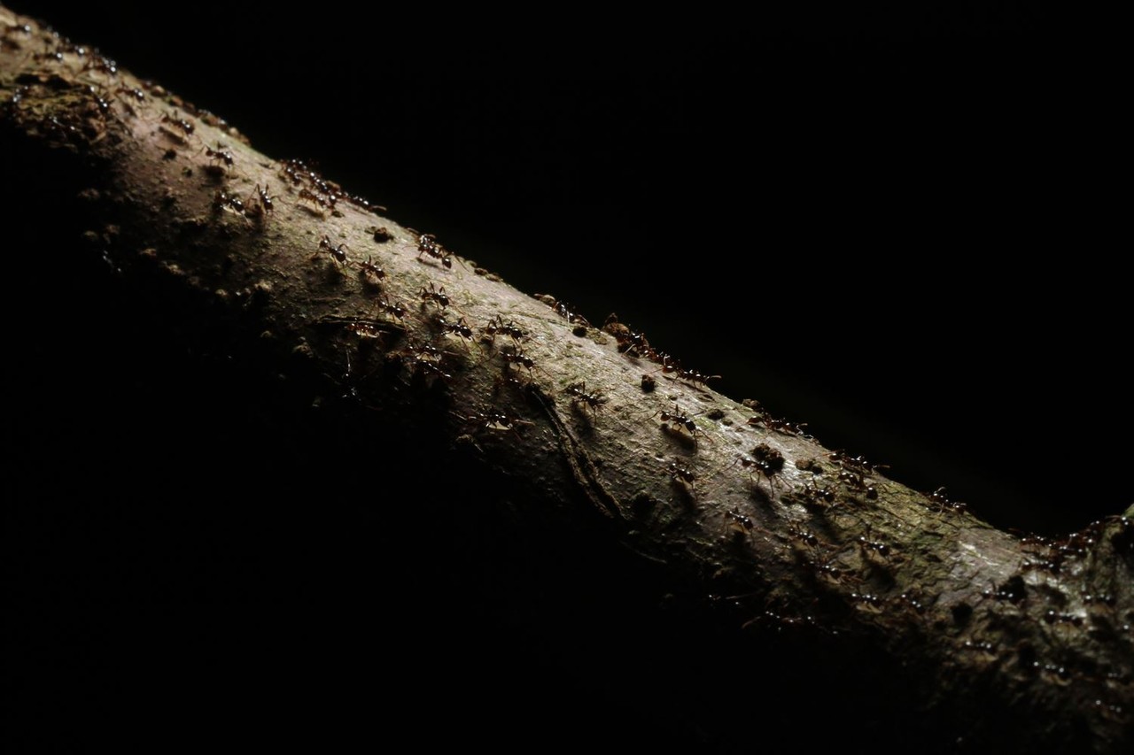 少し暗くなり始めた夕方、マレーシアでヒメサスライアリの一種の引っ越し行列を見つけました。