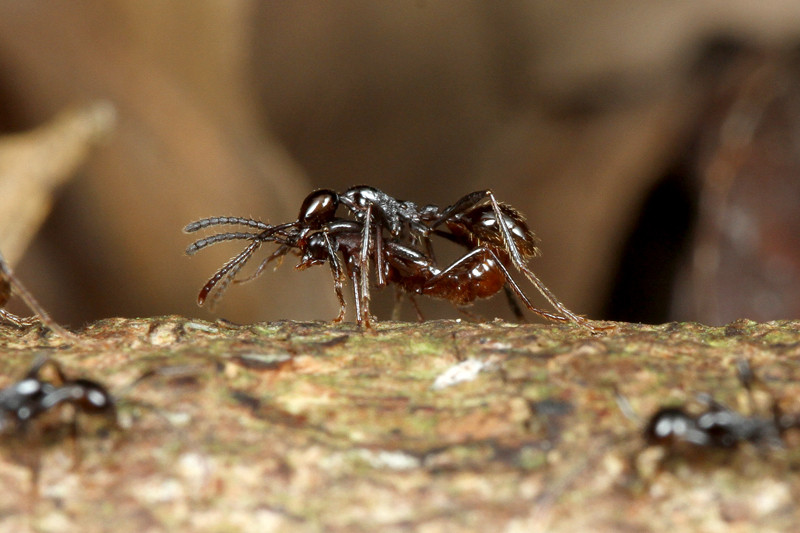 ヒメサスライアリには眼はないので見えていませんが、ハエが羽ばたく風圧で危険を察知した働きアリが立ち上がって威嚇しています。