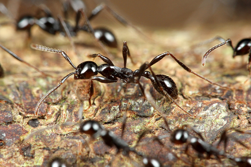 ハネカクシなどの好蟻性昆虫を探すため観察をしていると、行列の近くで怪しく輝く眼を持つ昆虫を発見。