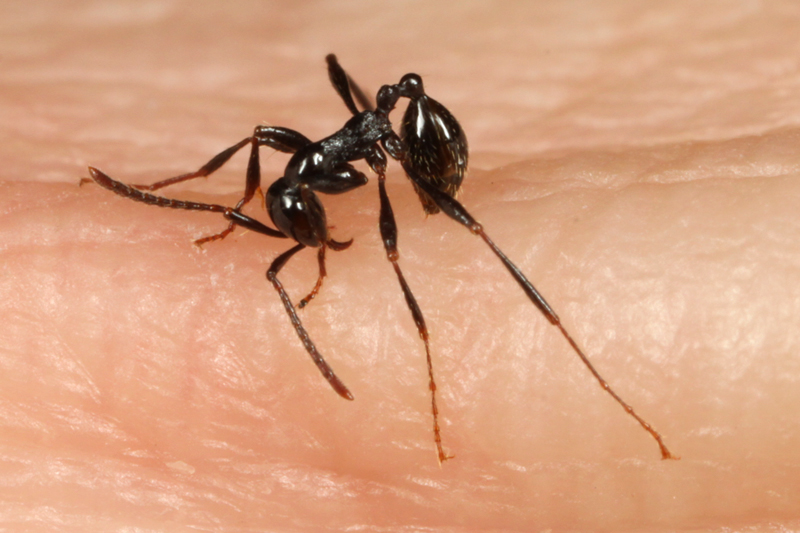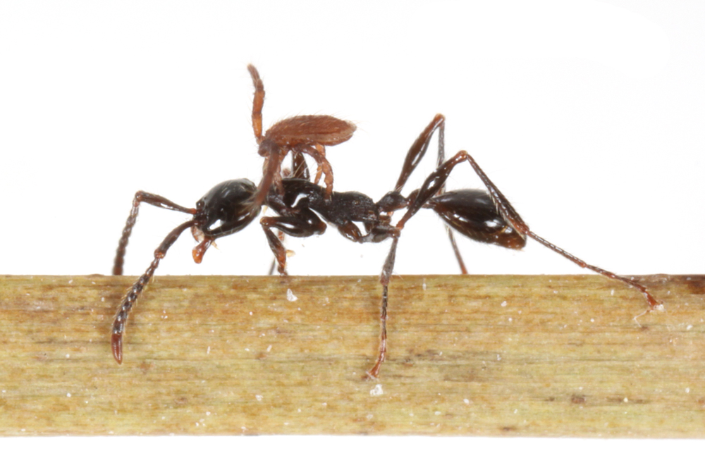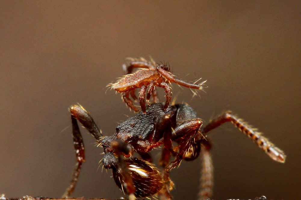 このダニは、長い前脚をゆらゆら動かしながら、アリの胸部にしっかりとしがみついています。