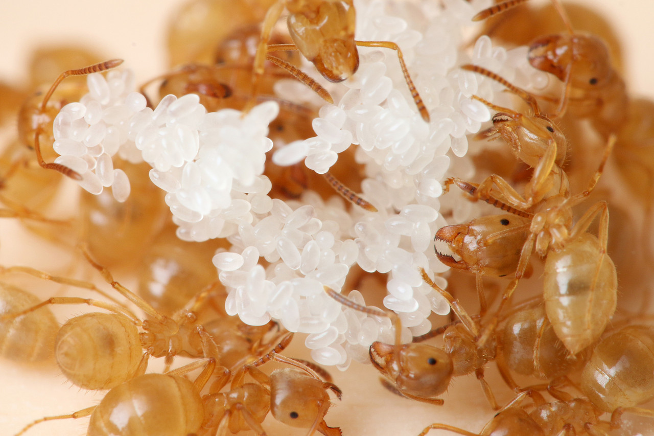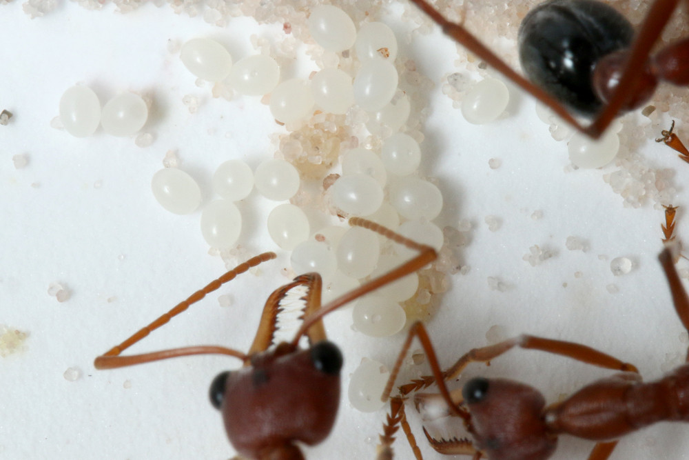 左の働きアリがアゴで咥えているのは女王が産卵した卵です。