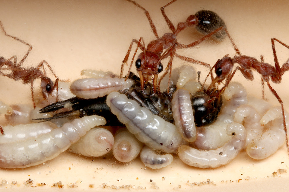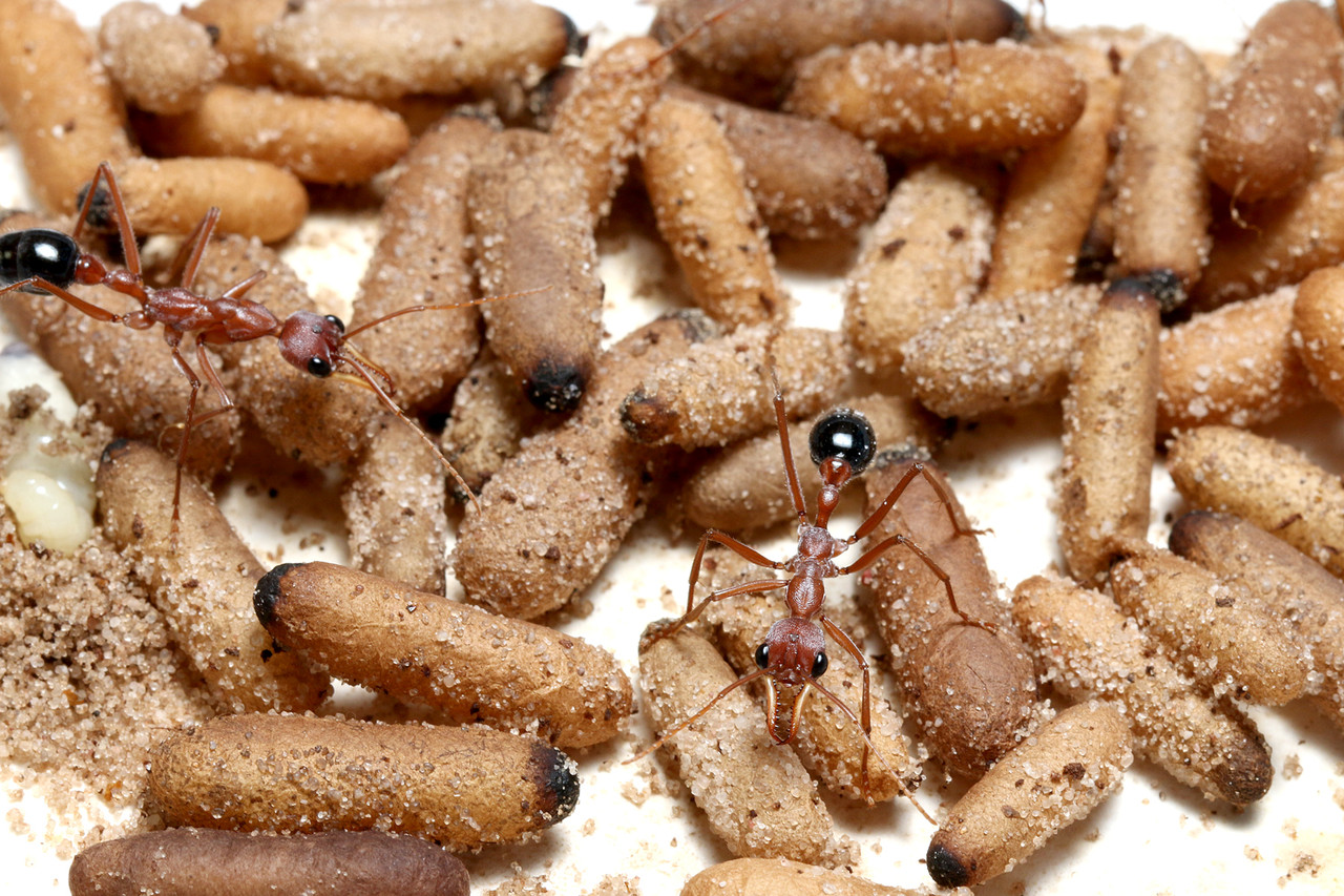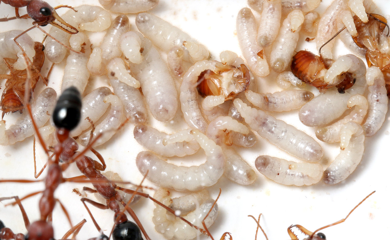 普通のアリの幼虫は身動きはほとんどできませんが、ブルドックアリの幼虫は背中を波打たせることで進むことができます。