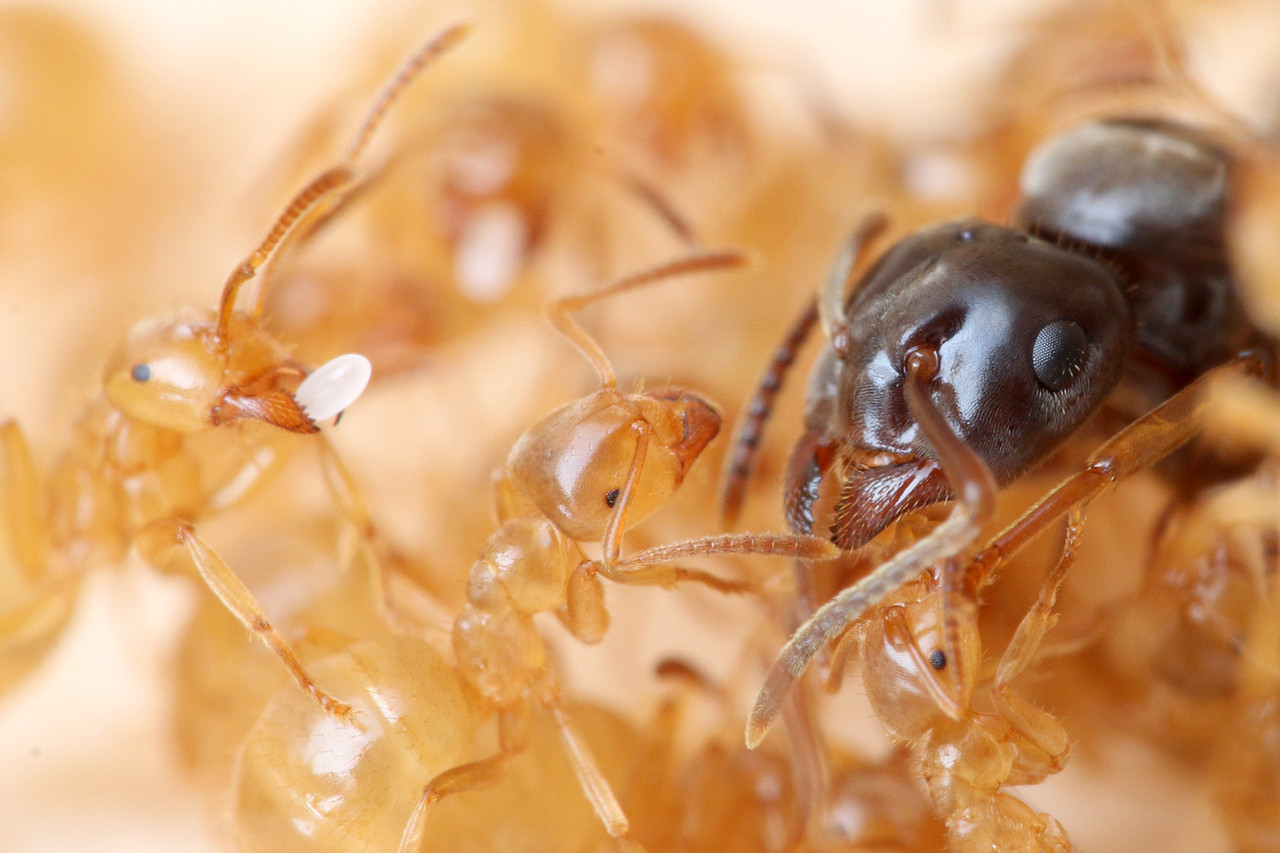よく見ると、色が白っぽい羽化したばかりの働きアリもたくさんいます。