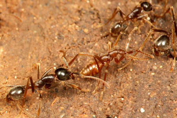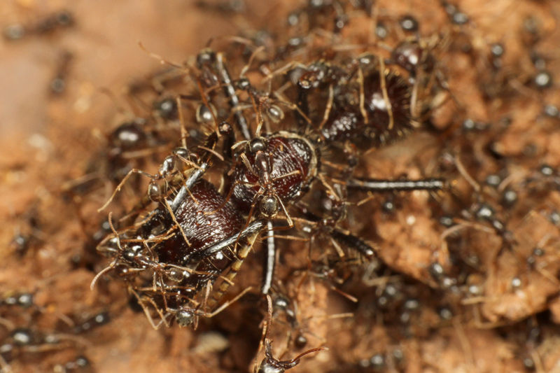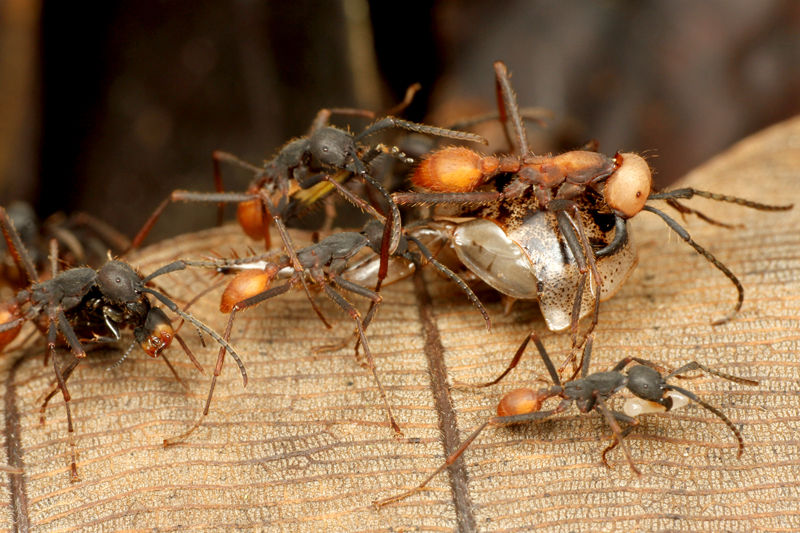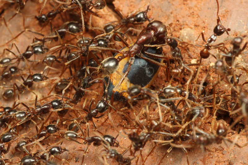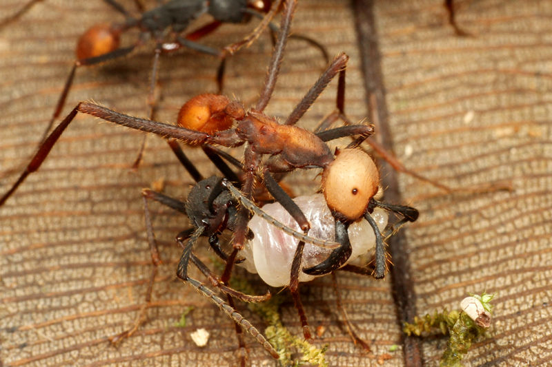 小さな獲物は1匹で運びますが、大きな獲物は複数の働きアリで運ぶ事があります。