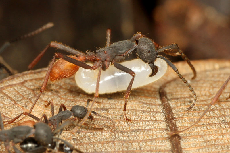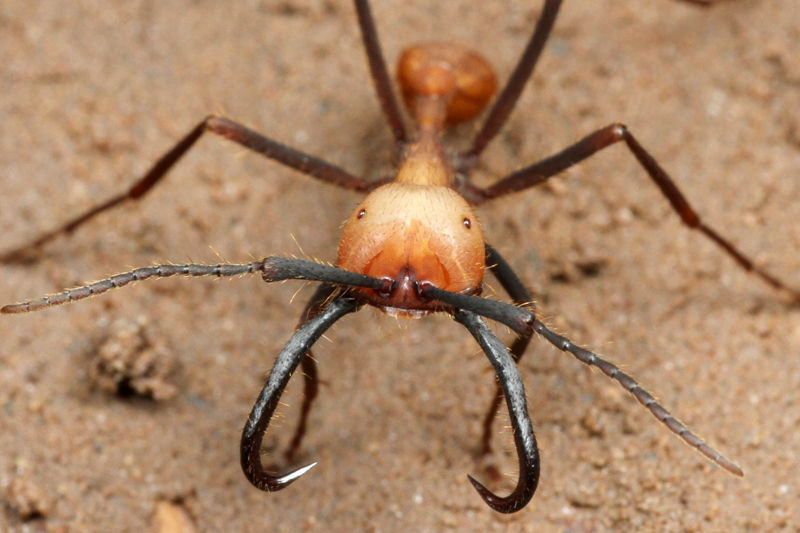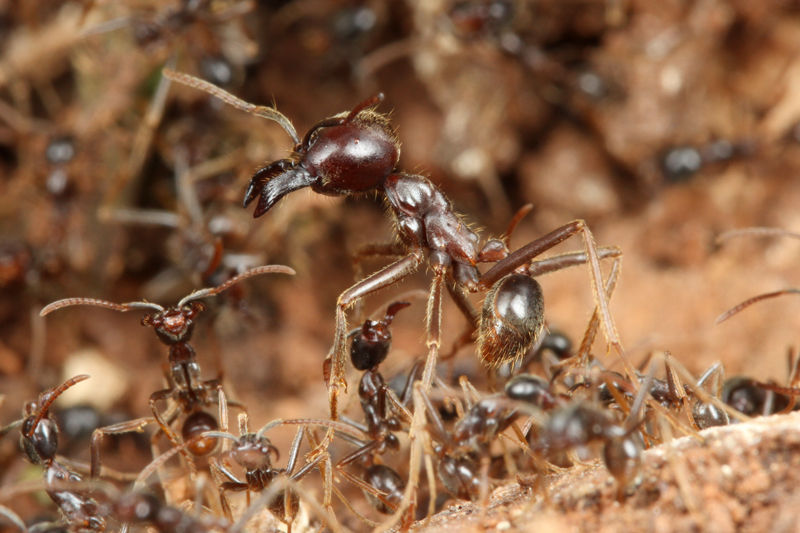 グンタイアリの働きアリは、個体によって大きさに大きな差があり、最大個体の兵隊アリは体に不釣合いなほど巨大な湾曲した鎌のようなアゴを持ちます。
