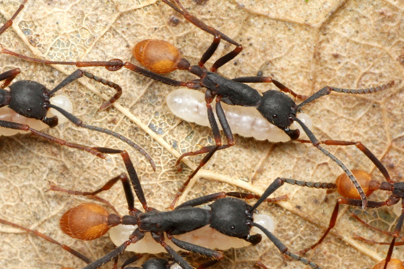この行列はアリの巣を襲ったようで、アリの幼虫が多く運ばれてきました。