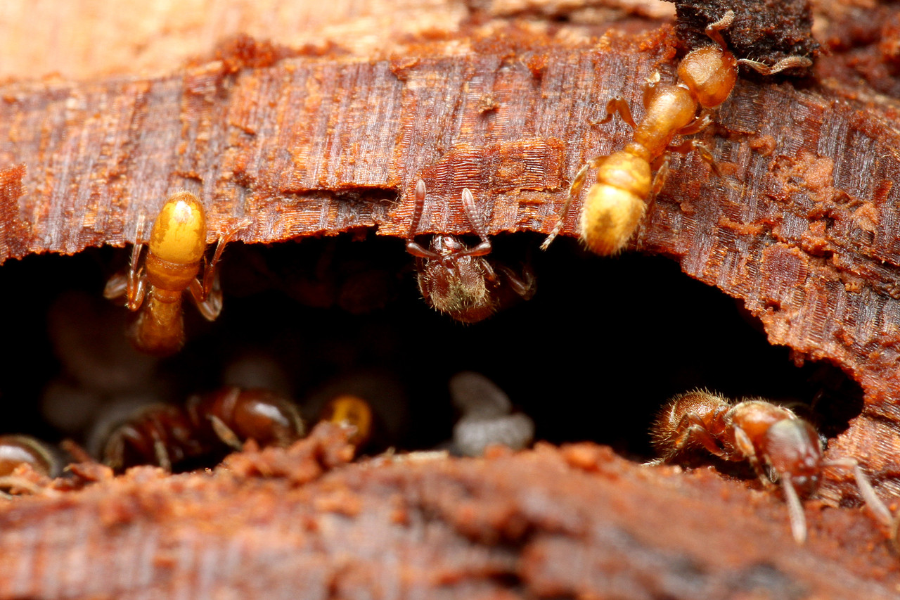 幼虫を守るメダカダルマアリ Discothyrea kamitetaの女王アリ。