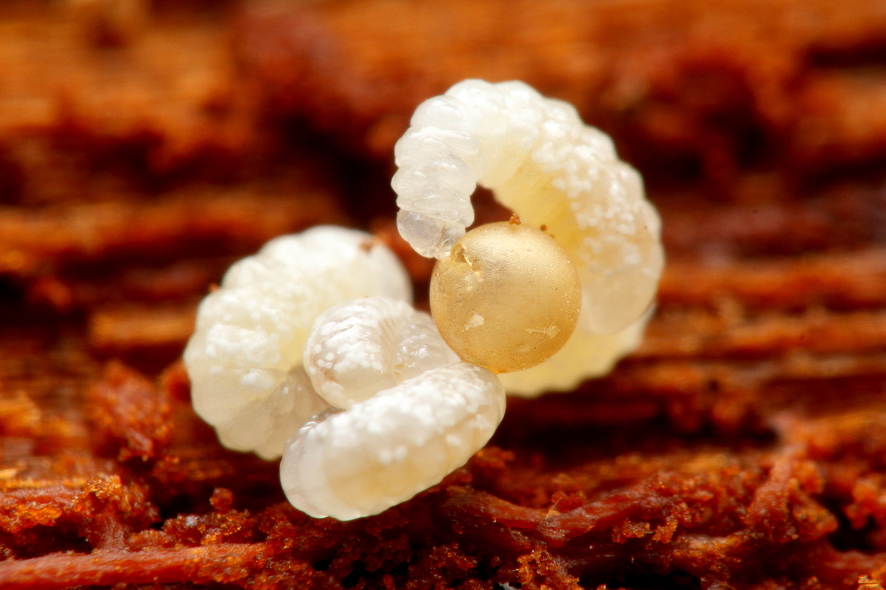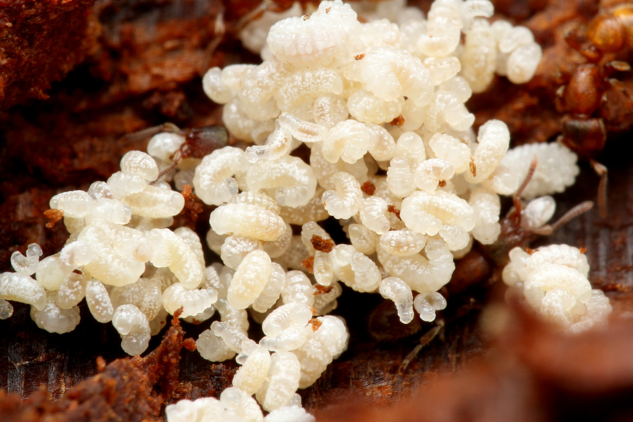 黄色い卵にカギバラアリの幼虫が齧りついています。