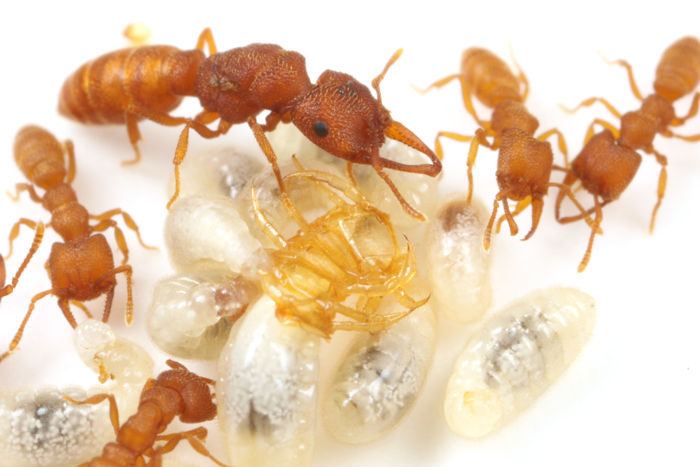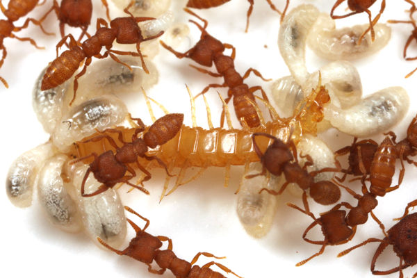 ジムカデを捕らえたノコギリハリアリは、獲物の元に幼虫たちを運んで与えます。