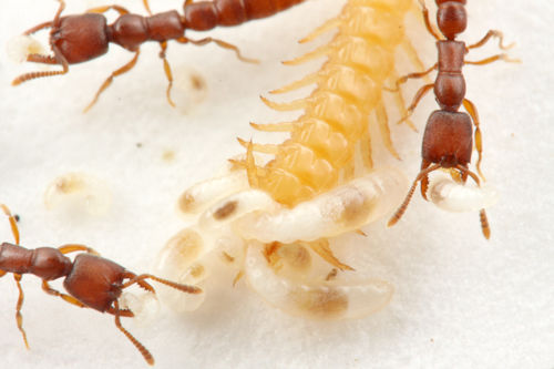 ノコギリハリアリの幼虫たちは、自らムカデに噛み付いて食事をするのです。