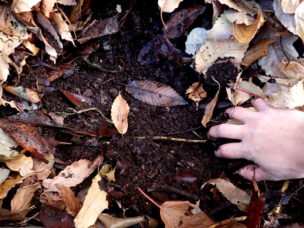 落ち葉の積もった場所で、湿った土が見えるまで掘ります。