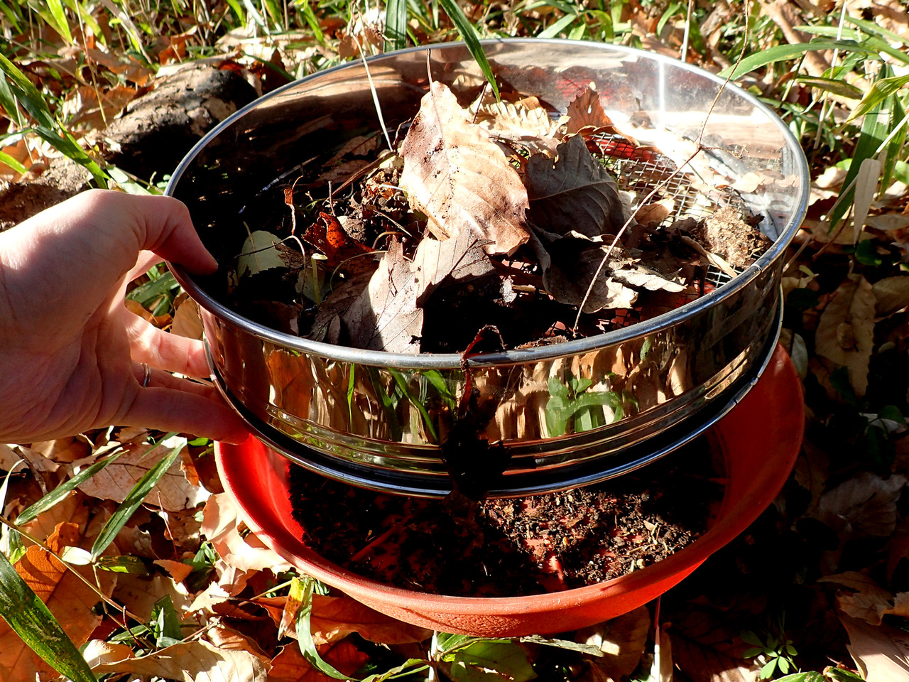 黒く湿った落ち葉や土をふるいで篩うと1〜3cmほどの小型ムカデがすぐに見つかります。