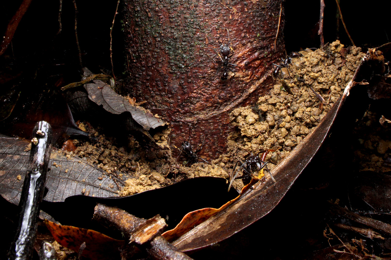 通常、多くのアリは結婚飛行後は巣に閉じこもって子育てをするのですが、パラポネラの女王は毎日巣から出てエサを探しに出かけます。