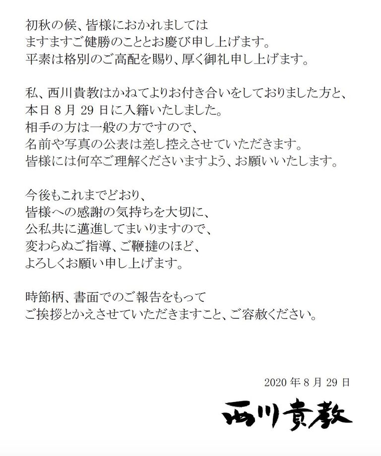 ・2人は2017年4月から、大阪のラジオ番組でパーソナリティーを務め、西川は水曜、夫人は木曜を担当していた縁で知り合った。当初は友人関係だったが、18年2月に写真週刊誌に撮られたことをきっかけに、結婚を前提とした真剣交際に発展。夫人は所属事務所を辞めて一般人になり、西川を支えてきた。(サンスポ)