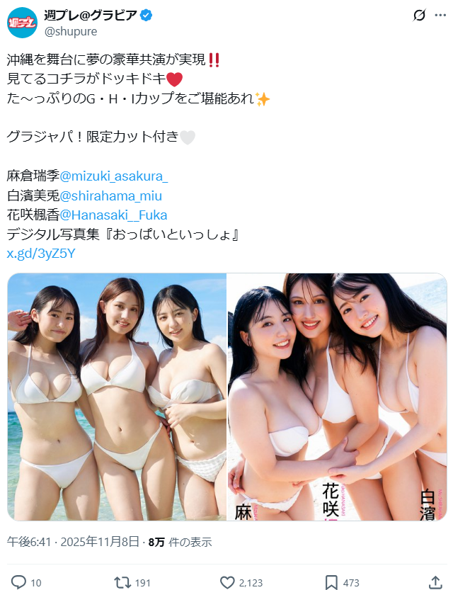 次世代美少女を発掘するオーディション『美少女図鑑AWARD2023』で3冠を受賞した、“鳥取が生んだ奇跡の美少女”こと白濱美兎(しらはま みう=19歳)が、2025年11月9日発売の雑誌『週刊プレイボーイ』巨乳特集号で、表紙&巻頭グラビアを飾ることがわかりました。