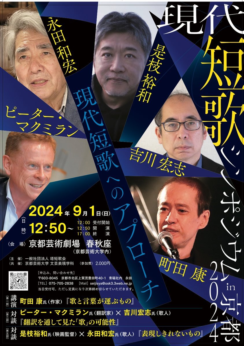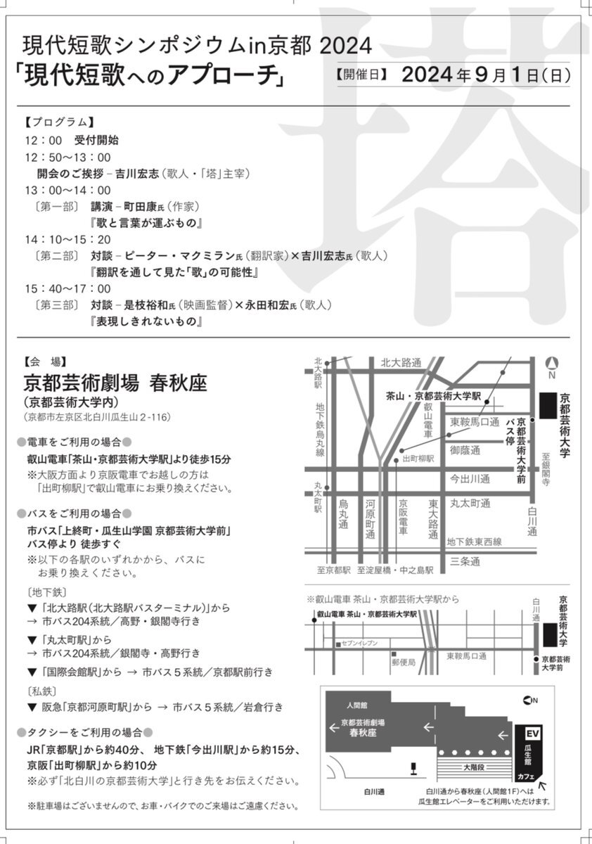 現代短歌シンポジウムin京都2024 Date : 2024年08月31日 mixiチェック <> 是枝裕和さんに町田康さんに……とても豪華なゲスト陣が集結します。我が京都芸術大学文芸表現学科も共催するイベントです。台風が心配でしたが、無事に開催できそうです。僕も学科長として受付で来場者をお迎えします。盛会祈願! 「現代短歌シンポジウムin京都2024」 9月1日(日)12:50〜 於:京都芸術劇場春秋座 主催:一般社団法人塔短歌会 共催:京都芸術大学文芸表現学科 カテゴリなしの他の記事