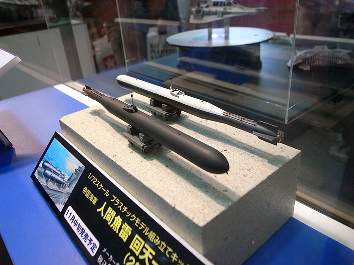 ■「人間魚雷・回天」 以前は靖国神社にある遊就館のおみやげコーナーで販売していた(そこでないと買えなかった)回天が2機セットで一般販売するようです。何か変更が加えられるのかなぁと思って、近くに居るスタッフらしき人に聞いてみたところ、特に変更箇所は無く、遊就館で買える物と同じとか。ちなみに、よく見たら、質問に答えてくれたのはファインモールドの鈴木社長本人でした。後で気付いてビックリ。