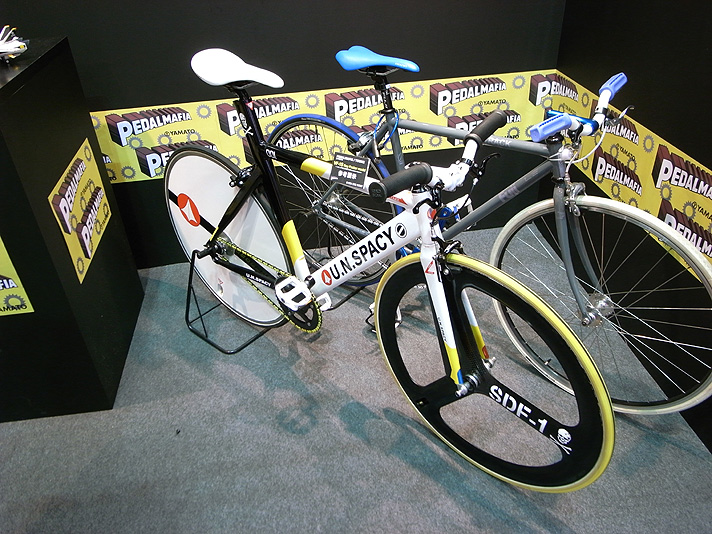 ■YAMATOのブースにさりげなく飾ってあった、商品より目を惹いたのがこの「マクロス仕様の痛チャリ」。これはありっしょ。むしろこの方向が有ったか!と目からうろこが。塗装で判り難いですが車体をよく見ると恐らくフルカーボン。ホイールもカーボンすね。なのにピストと言う変態仕様にいたく感動。すげぇ。