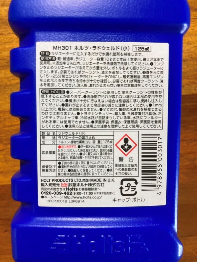 滲み出場所が特定できないので「Holts 漏れ予防剤」を試すことにした。どろどろの添加剤をラジエーター栓から溢れ出ないように数回に分けて投入し、リザーバータンクはFULLラインまで在庫 LLCを使い切って様子を見ることにした。