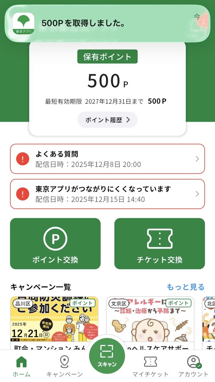 翌日最終検証キャンペーンへの参加分の 500ポイントが溜まっていた。