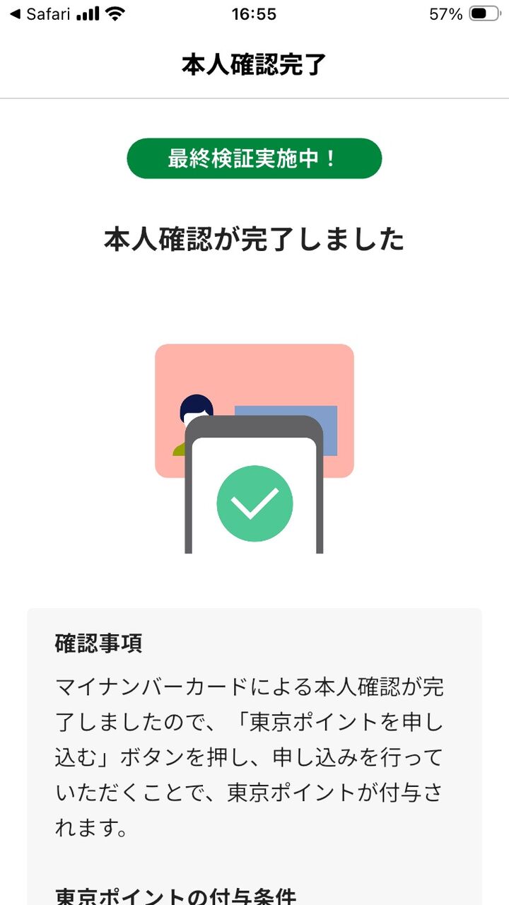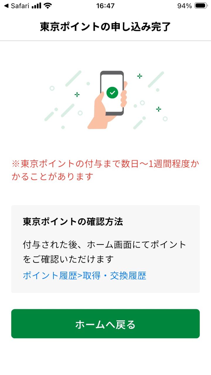 情報とデバイスなどは全て用意が出来ているので実行したが 30分ほどで完了して東京ポイントの受け取り準備が完了した。