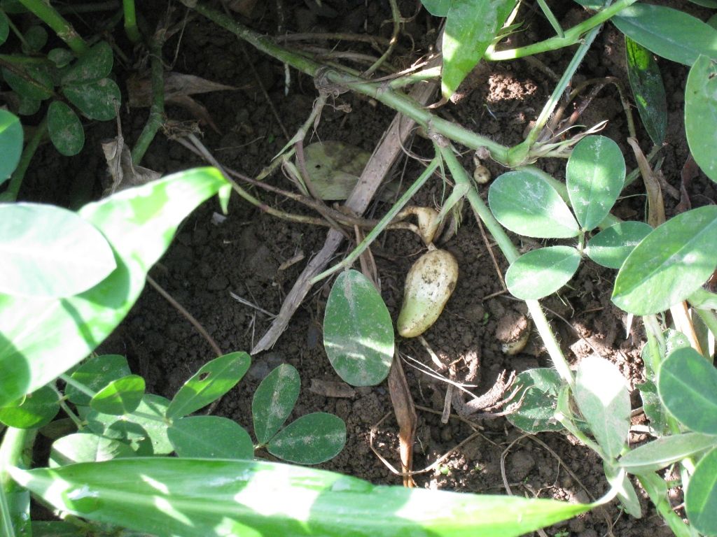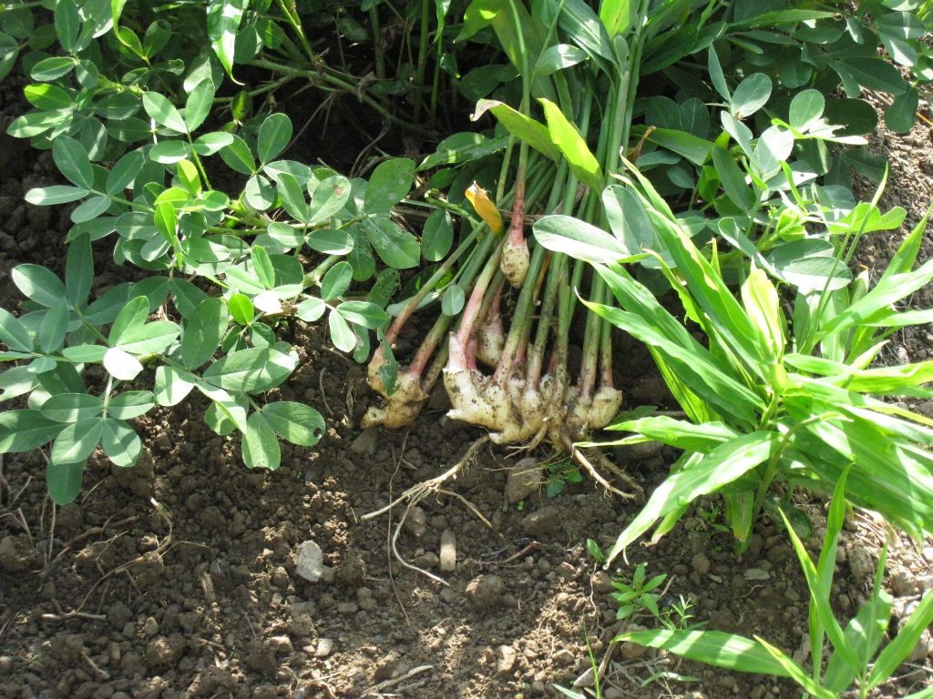本来は一晩水につけてから蒔くべき工程を省いたためか発芽率が50%程度だった落花生が最近成長が旺盛になってきました。しょうが(三州白芽)付近まで侵入してきたので「葉しょうが」をズボッと収穫したところ落花生ががらがらと絡んでいました。