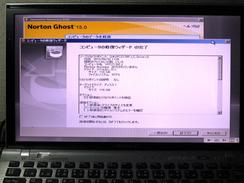 手持ちの Norton Ghost 15の機能を使い SSDをドライブ丸ごとバックアップして一挙に復元できるブータブルな CD-Rが作成できました。