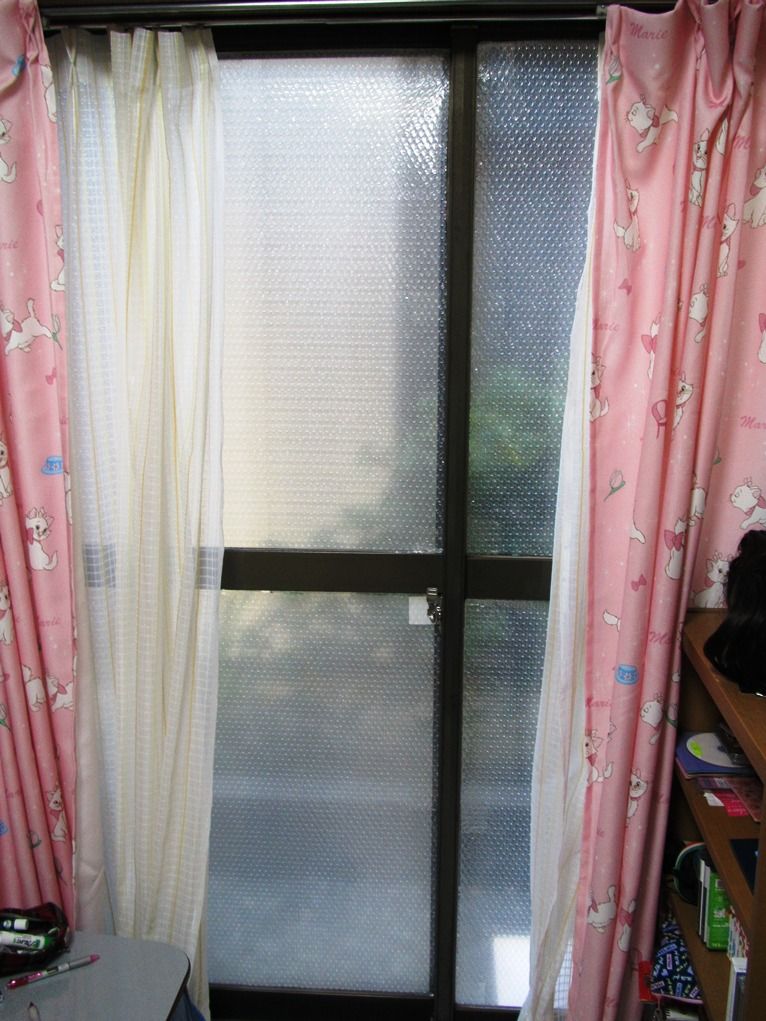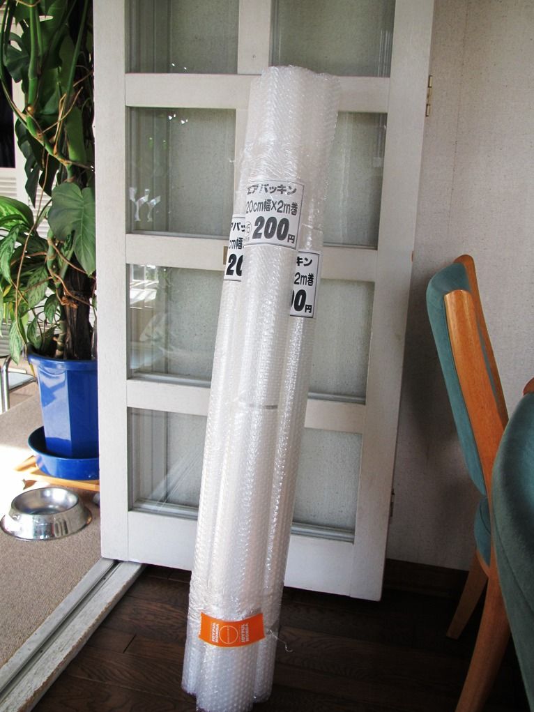 幅・高さ1間のカラス窓には2重カーテンがありますが、1日中日陰なので結露が凄いので換気が絶やせません。JOYFUL本田で購入した120X200@200円のエアーキャップをカットして張り付けました。 ポイントはエアーキャップの凸凹面をカラス面側にしてより多くの空気の層を確保すること。
